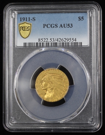 1911-S INDIAN HEAD GOLD HALF EAGLE $5 PCGS AU53 (29554)
