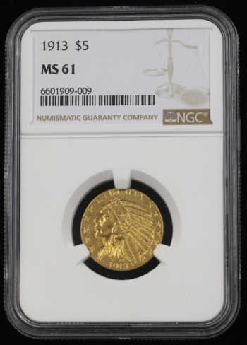 1913 INDIAN HEAD GOLD HALF EAGLE $5 NGC MS61 (09009)